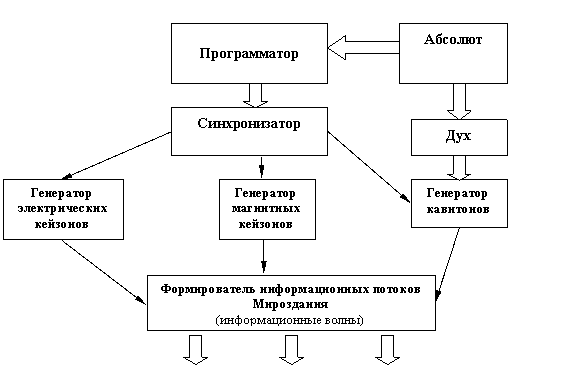 жизнь! Всюду Сознание!» [24]. Электрические кейзоны скользят вдоль силовых электрических линий, представляющих упоминавшуюся Пространстванную решетку, магнитные кейзоны (более медленные) скользят вдоль магнитных силовых линий, образованных «Матричной сетью», однако и те, и другие могут по заданию Абсолюта перемещаться вне силовых линий. Скорость волны кейзонов огромна – она может превышать сотни парсек/с . Источником электрических и магнитных кейзонов являются генераторы соответственно электрических и магнитных кейзонов, находящиеся в Абсолюте и приводимые в действие Абсолютом. Все процессы, связанные как с воспроизводством главных функциональных составляющих системы, порождающей информационные потоки, так и самого способа создания Информации, целиком и полностью управляются Абсолютом. Примерная структурная схема информационного комплекса приведена на рис.2.