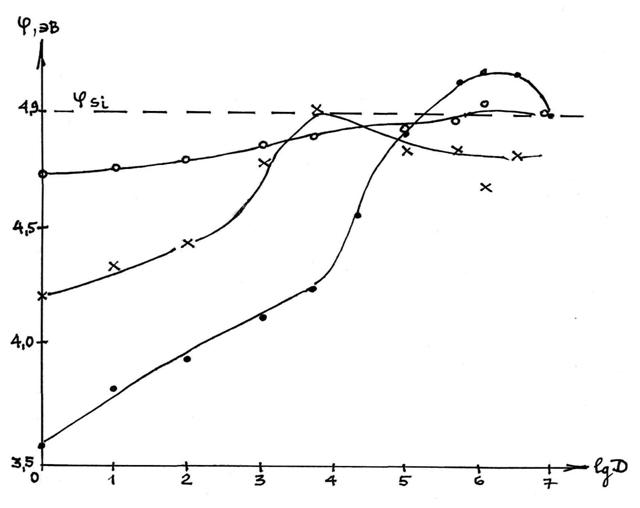 работы выхода электрона (РВЭ) от температуры φ=f(t), от дозы (D) поглощенного излучения φ=f(lgD), а также