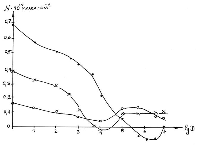 обычно принимаемый Тогда N=∆φ/4π∙cosα∙æ=0.58∆φ∙1015 молек. H2O∙см-2. Результаты измерений в виде зависимостей φ=f(t), φ=f(lgD), φ=f(τ) приведены на рис. 1,2,3, соответственно. Данные расчета N по формуле (2) показаны на рис.4. Обсуждение