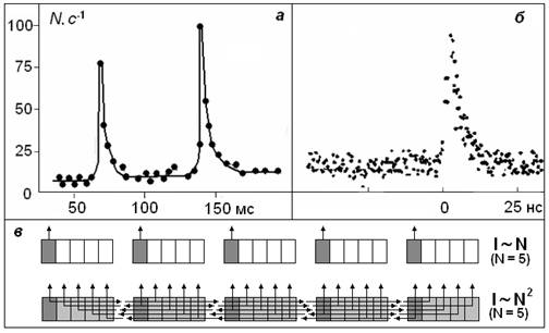 микротрещинами. Результаты лабораторных экспериментов и натурных наблюдений (рис. 1-а) показывают, что на фоне постоянного акустического сигнала (I = dN/dt ~ N), излучаемого нагруженным образцом горной породы, возникает взрывоподобное нарастание (типа цепной реакции) количества раскрывающихся трещин N (акустических импульсов) в единицу времени t: dN/dt ~ N 2 [4]. По аналогии с оптикой, это явление можно считать акустическим сверхизлучением. Ясного понимания физики этого явления пока - нет. Предположим, что в объеме среды находящейся под внешним давлением - возникает некоторое количество источников акустических импульсов. Это могут быть раскрывающиеся трещины [2], образующиеся дислокации, образование и разрушение водородных связей среды и пр. Каждая такая дислокация в определенных условиях излучает акустический импульс. Сумма таких импульсов составляет акустический фон N. Представим себе ситуацию, в которой такая дислокация связана не очень пока ясной связью с другими дислокациями таким образом, что она (эта дислокация) стимулирует излучение акустического импульса другими. Например, акустические волны, возникающие при разрушении N дислокаций, могут способствовать разрушению других, связанных (сцепленных, запутанных) с ними (N – 1) дислокаций. В результате акустический фон возрастает с N импульсов в единицу времени до N + N(N – 1) = N 2, что и требовалось доказать (рис. 1-в). Принципиальным моментом в этой модели остается пока не ясной физика такой связи. По физике, обсуждаемое нами явление близко к сверхизлучению Дикке (коллективное спонтанное испускание электромагнитного излучения), которое было предложено им задолго до изобретения лазеров [5]. Дикке показал, что система, состоящая из N инвертированных двухуровневых атомов, может - спонтанно перейти в основное состояние за время, обратно пропорциональное числу атомов, что приводит к усилению потока излучения ~ N 2. На рис. 1-б показана картина, очень близкая к 1-а. В отличие от 1-а, здесь показано как ведут себя некоррелированные фотоны в момент возникновения между ними квантовой запутанности [6]. (Об этом немного позже). Формирование