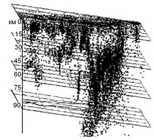 похож на некий объем наполненный газом, расположенный ниже 60 – Афтершоки Как известно, после сильного землетрясения в области его очага возникает рой повторных землетрясений, глубина гипоцентров которых, как правило, находится выше, чем плоскость основного удара (рис. 9) [36]. Согласно нашей модели, для образования объемных волн, возникающих при прохождении ударной волны от гипоцентра к земной поверхности, на ее фронте должны развиваться давления порядка предела текучести вещества, через которое распространяется ударная волна. Очевидно, что в таком случае на фронте ударной волны должна происходить дополнительная накачка среды её энергией, что по прошествии определенного времени, должно вызывать каскад землетрясений – афтершоки. Представим себе очаг землетрясения в виде прямоугольного двумерного тела, горизонтальная ось которого - равна по величине длине разлома главного землетрясения L, а вертикальная – показывает глубину гипоцентра h. Поделим величину h на ряд слоев n, в каждом из которых, при достижении соответствующих условий, может возникнуть ударная волна – афтершок. Известно, что во времени, перед каждым ударом землетрясения наблюдается специфическая зона «молчания». Она достигает нескольких часов, иногда - суток. Как отмечалось, время начала структурного перехода в среде не является малым. Предположим, что в течение некоторого времени (времени молчания) – t происходит формирование условий в слое, приводящих к образованию ударной волны. Очевидно, что чем сильнее землетрясение (М), тем больше это время t ~ М. Ударная волна основного землетрясения распространяется вверх и основной его удар приводит к формированию N(t) афтершоков, параметрами которых можно считать: магнитуду Мi, время формирования ti и длину разлома Li., которая однозначно связана с магнитудой Li ~ Мi. Известно, что статистика афтершоков подчиняется