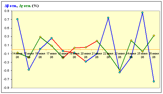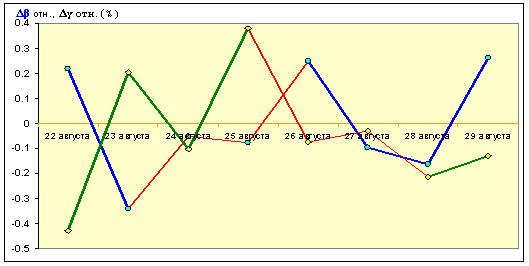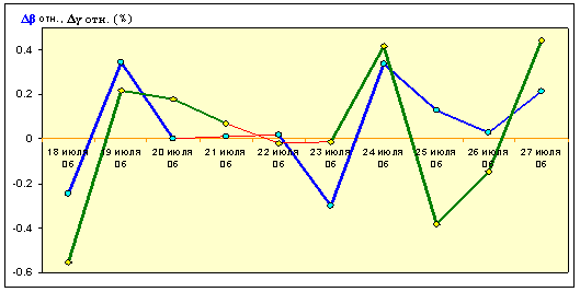 управляемой кодами действия Абсолюта. При распаде матрицы ее ячейки – кейзоны, освободившись от структурирующего влияния матрицы, выстраиваются определенным образом (опять же – в соответствии с кодами действия) и порождают электроны или позитроны (иногда – и то, и другое). Результатом этого процесса и является то, что принято считать β-излучением. Тот факт, что процесс распада информационной матрицы предшествует распаду «сетки» магнитных кейзонов, окружающей ядро атома, хорошо объясняет полученные результаты в экспериментах по изучению динамики активности изотопов Cs137 ([17]), где нами впервые был обнаружен отчетливый временной сдвиг (отставание) характерных зон и экстремумов на характеристиках посуточных значений интенсивности γ-излучения от таковых на аналогичных графиках временных значений интенсивности β-излучения. Типичные примеры таких временных сдвигов приведены на графиках относительной интенсивности β- и γ-излучения и их производных для трех разных периодов измерений активности изотопов (рис. 1-9).